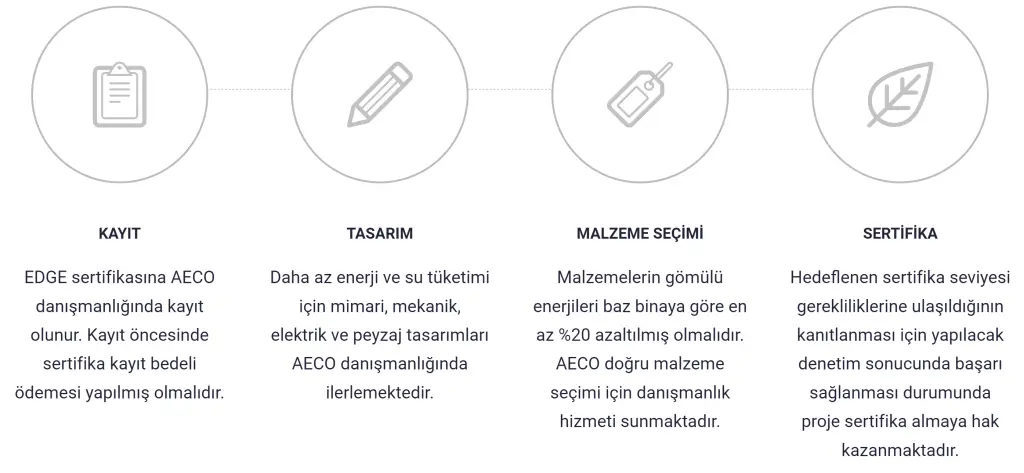 AECO, EDGE yeşil bina sertifikası için danışmanlık hizmeti vermektedir. Danışmanlık hizmeti kapsamında, EDGE sertifikasının alınması için gerekli tüm ön koşul kontrolleri yapılır ve ardından tasarım ile inşaat çalışmaları için gereklilikler proje paydaşları ile paylaşılarak sertifikasyon sürecine devam edilir.