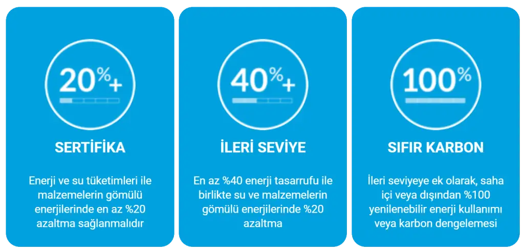 EDGE sertifika sistemi eşik değerler üzerine kuruludur. 3 farklı EDGE sertifika seviyesi bulunmaktadır. Bunlar Yalın (Certified), İleri Seviye (Advanced) ve Sıfır Karbon (Zero Carbon) olarak isimlendirilmiştir.